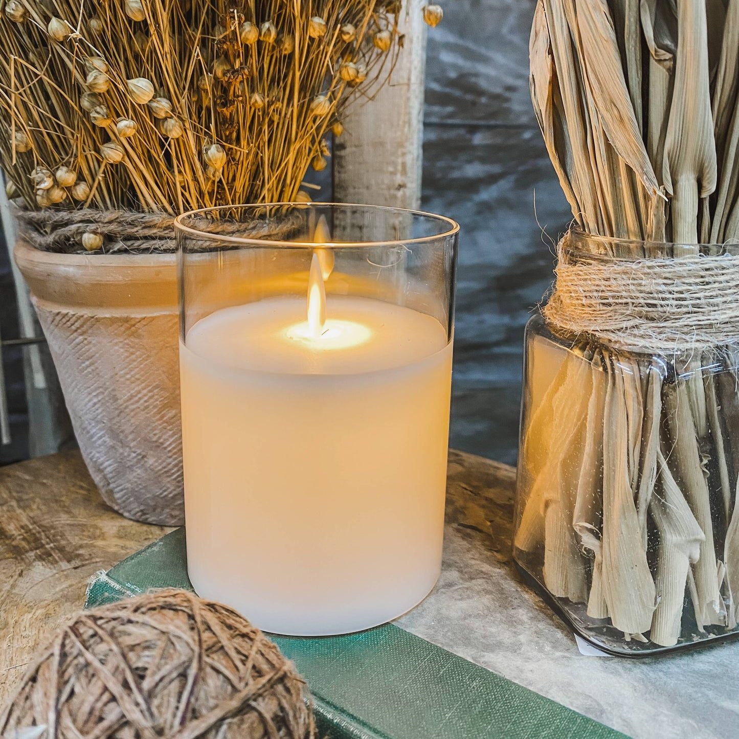 This LED candle features a sleek and modern design with a clear glass outer casing, allowing for maximum visibility of the moving flame effect. The minimalist aesthetic of the clear glass adds a contemporary touch to any space.