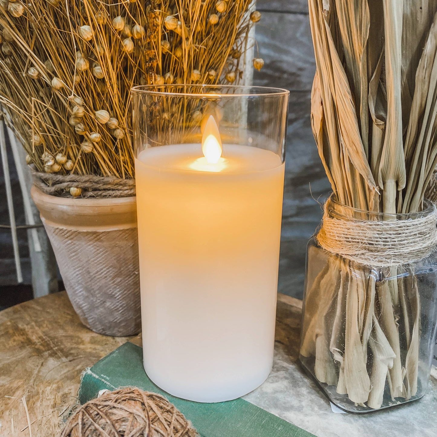 The Clear Glass Cylinder Moving Flame LED Candle combines modern design with practical functionality, making it an ideal choice for adding warmth and ambiance to your living space while offering the convenience of timer operation.